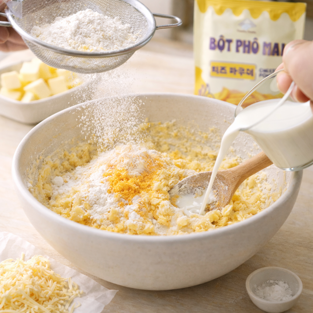 - Rây bột mì + bột bắp + bột phô mai + muối